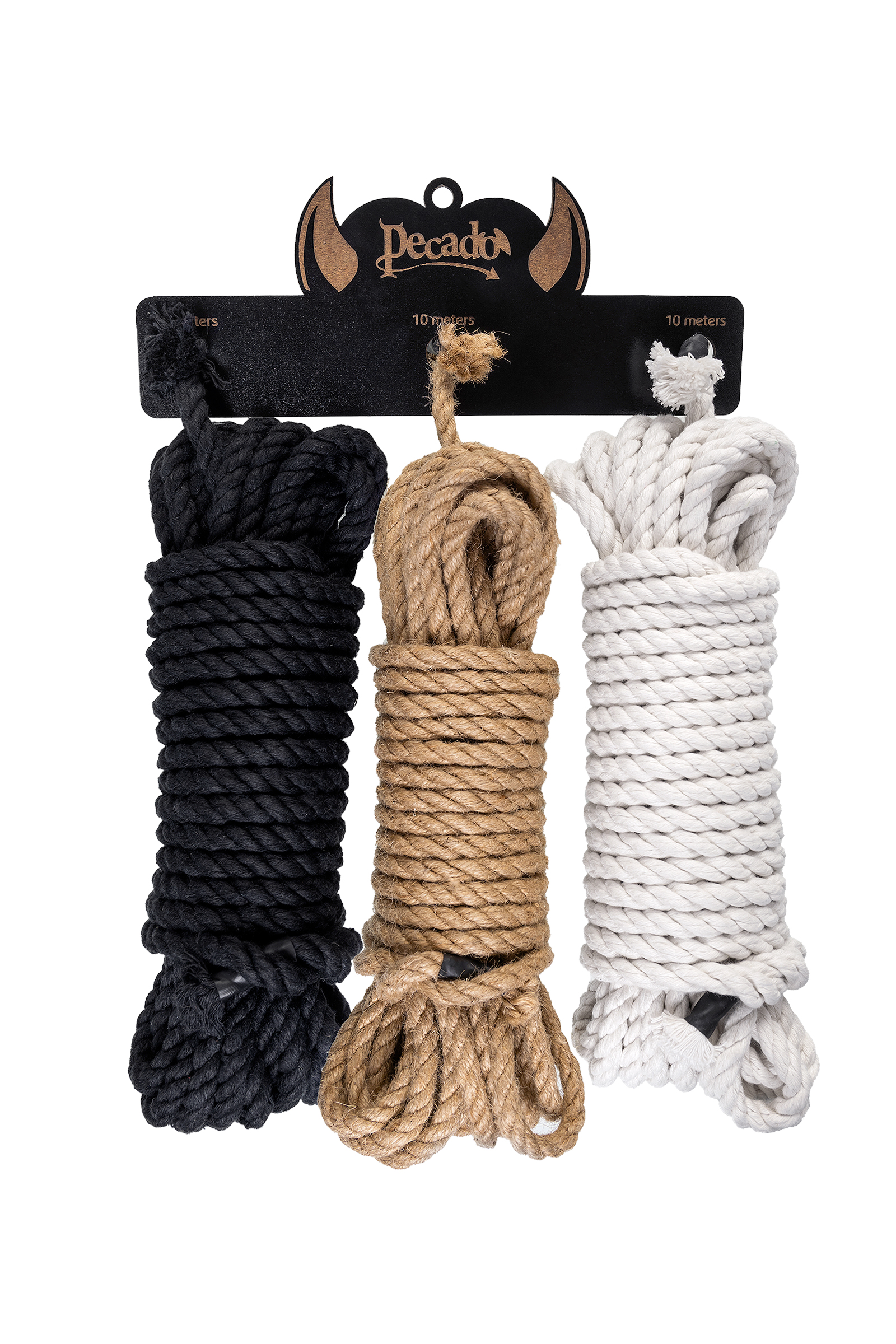 Готовы играть по-взрослому? Набор из трех веревок для бандажа от бренда Pecado BDSM. Создан специально для того чтобы в полной мере погрузится в искусство шибари, как для начинающих, так и для профессионалов BDSM. Комбинируйте цвета и получайте невероятные по красоте узлы, ваш партнер по достоинству оценить вашу фантазию. В комплекте три веревки: джутовая, хлопковая черная и хлопковая белая. Лучший способ избавиться от искушения - это поддаться ему. Так почему бы не сделать это прямо сейчас? Pecado BDSM – российский бренд, использующий высококачественные материалы и надежную, проверенную временем фурнитуру. Все изделия изготавливаются вручную из натуральной кожи, безопасный и экологичный материал не оставляет повреждений на запястьях. Натуральная кожа, металлические крепления и ремешки дают уверенность в надежной фиксации, устойчивости к механическим нагрузкам и долговременном использовании. Материал - хлопок, джут Толщина - 8 мм. Длина - 3 шт по 10 м.